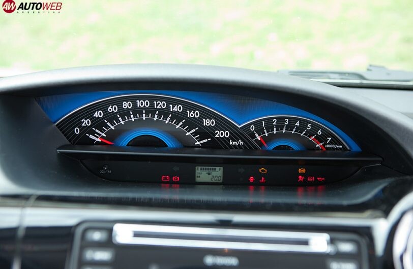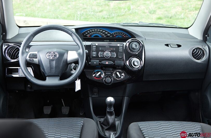 En el interior es donde el Etios se muestra más osado. Nos referimos concretamente al tablero en posición central, que además cuenta con instrumentos analógicos -para velocímetro y cuentavueltas- algo confusos por su color azulado de fondo y sus agujas en tono rojo.