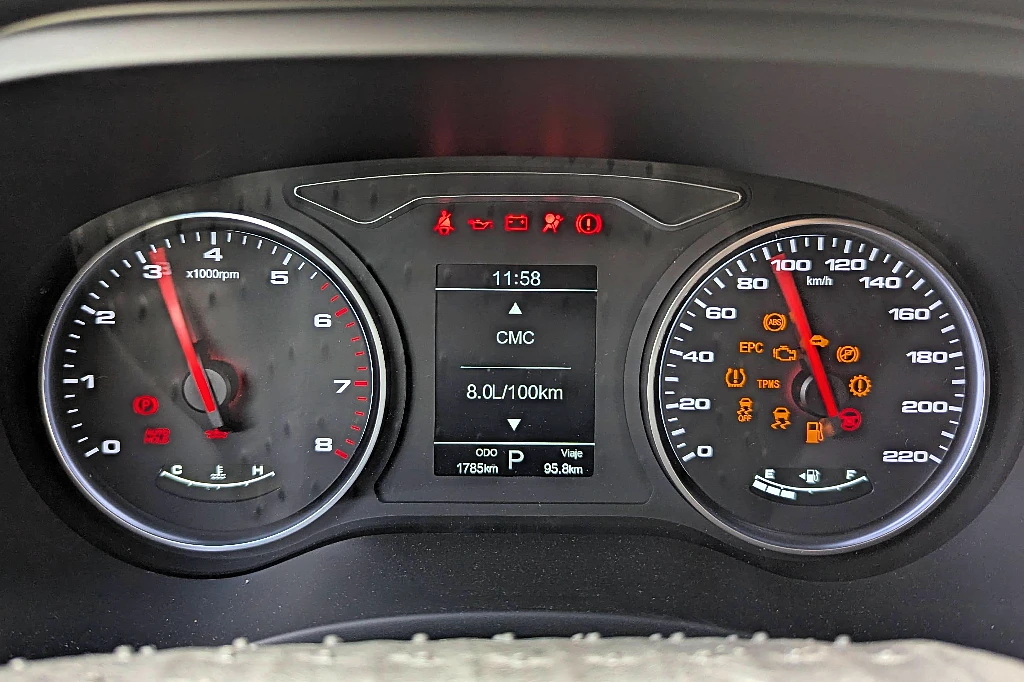 El tablero es analógico (en otros mercados ya hay uno enteramente digital) y de un diseño muy clásico, con una computadora central monocromática, con no mucha información.