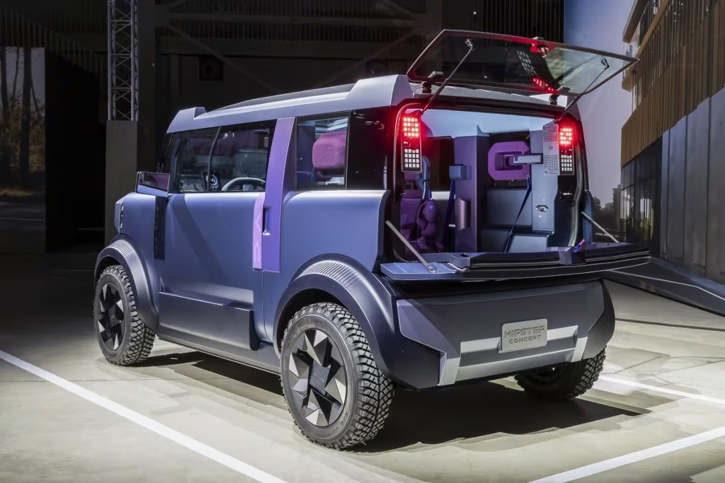 El diseño tiene algo del Land Rover Defender y lo visto en el prototipo Oli de Citroën (ver más), aunque es claramente más pequeño. El Hipster mide tan solo 3,00 metros de largo, 1,55 de ancho y 1,53 de alto.