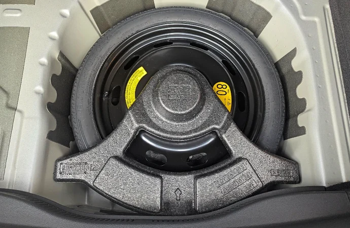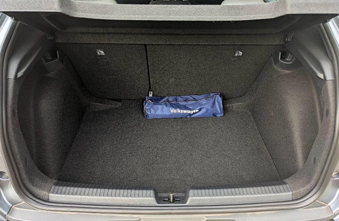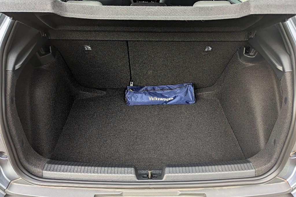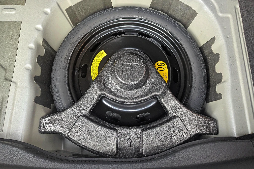 El baúl anuncia 350 litros (50 más que el Polo y 75 menos que el Nivus) y por debajo está el clásico auxilio temporal.