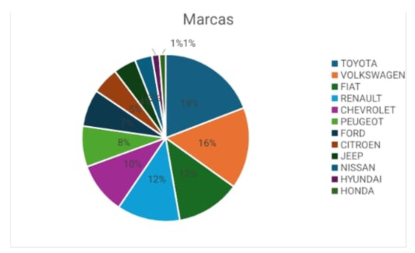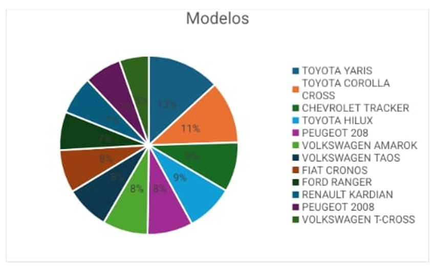 Por modelos, el más elegido es el Yaris con 13%, seguido de Corolla Cross con 11%, Tracker y Hilux con 9% y 208, Amarok, Taos y Cronos con 8%