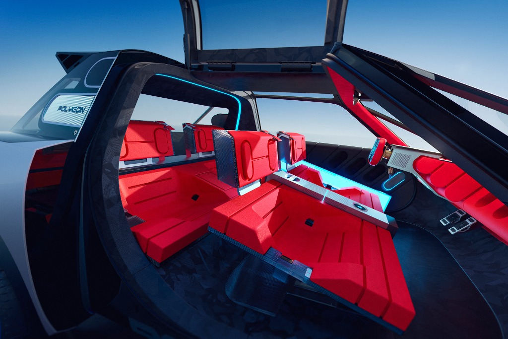 Creado en exclusiva para el juego Fortnite, el Polygon ofrece un diseño moderno, con un parabrisas muy lanzado, una única puerta levadiza en cada lateral, grandes ruedas situadas en los extremos y un interior con cuatro plazas.