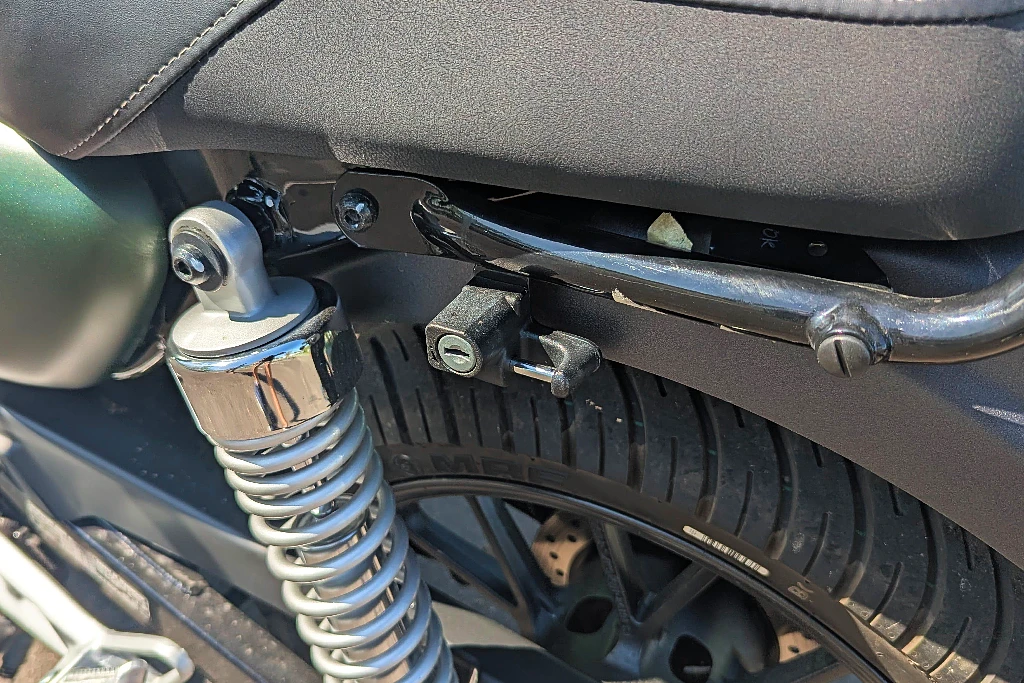 Bajo el asiento enterizo, que permite lleva a un acompañante, no hay espacio de guardado, pero a cambio cuenta con un práctico gancho en el lateral para llevar un casco suplementario o enganchar el propio.