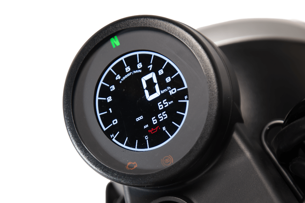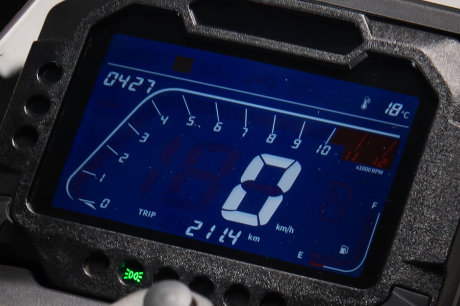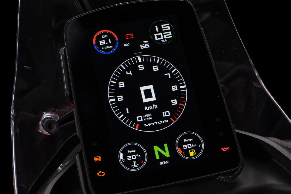 Cuenta con suspensiones KYB, frenos JJuan, ABS Bosch, neumáticos Pirelli de 19″ adelante y 17″ atrás, tablero vertical TFT de 7″ y faro full led.