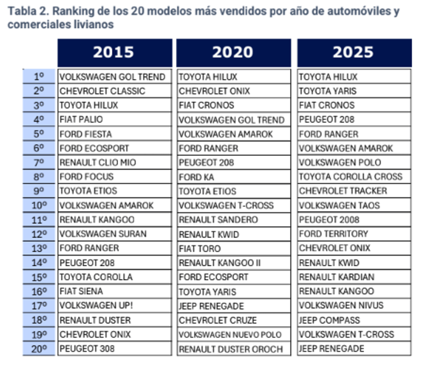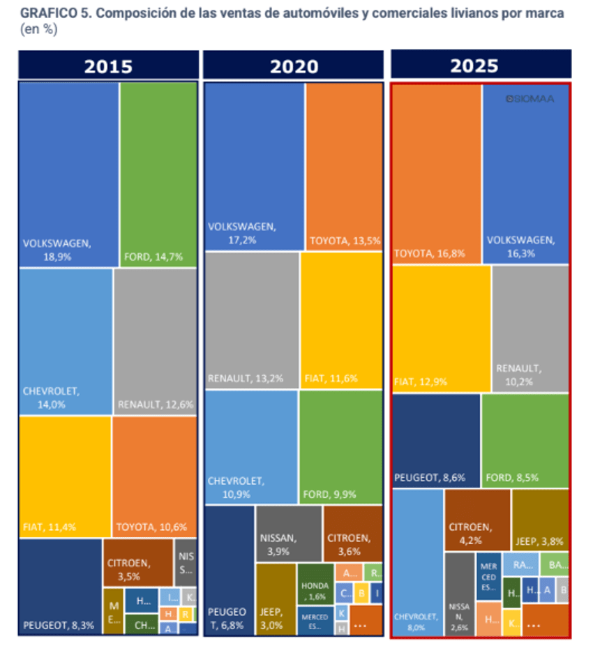 En 2015, las 10 principales marcas concentraban el 95,4% del mercado, participación que se reduce al 91,4% en 2025 por el ingreso de nuevas marcas. En este contexto, Ford y General Motors reducen su participación, mientras Toyota gana espacio y se consolida en el podio. Fiat también incrementa su peso, impulsada por el desempeño del Cronos desde su lanzamiento.