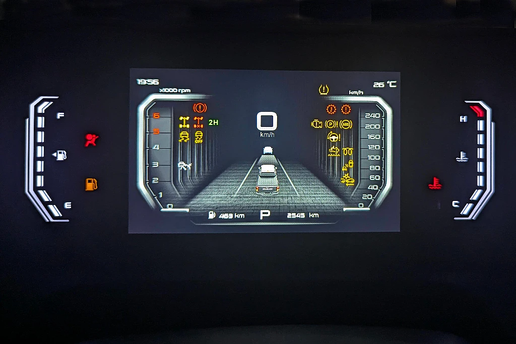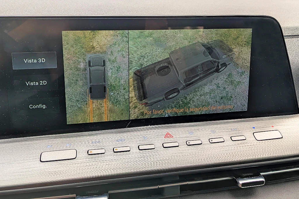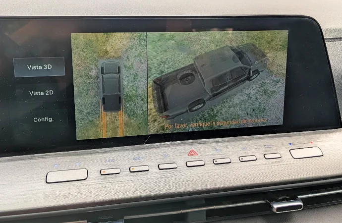 El tablero es digital, pero no ofrece más que una vista clásica (con muchos caracteres minúsculos), mientras que la pantalla es generosa, veloz y permite ver la nítida cámara 540°, incluso con el modo de chasis transparente que se agradece en el off road.